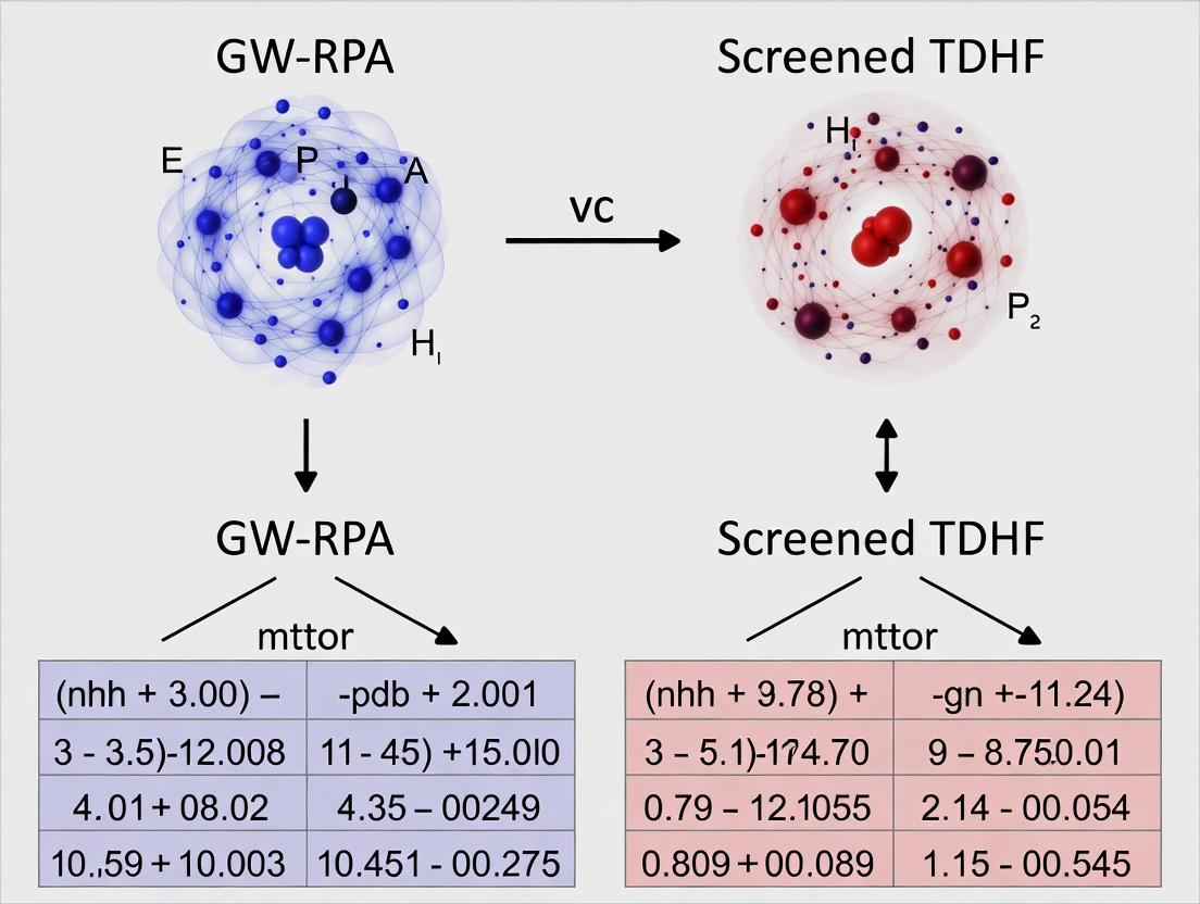 GW-RPA is a many-body perturbation theory approach that calculates quasiparticle energies via a self-energy operator (Σ). Screened TDHF incorporates a fraction of exact Hartree-Fock exchange within a time-dependent density functional theory framework, using a screened Coulomb potential to model electron-hole interactions.