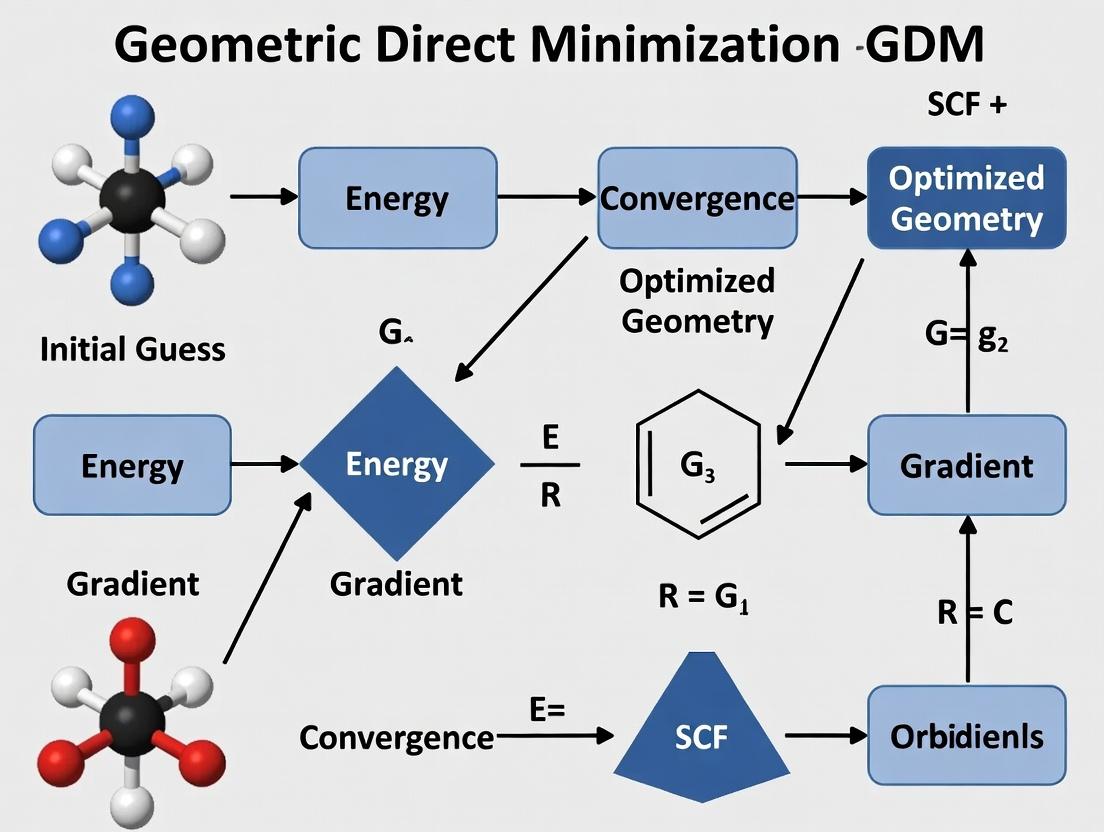 Geometric Direct Minimization (GDM): GDM reformulates the SCF problem as the direct minimization of the total energy functional with respect to the orbital coefficients, subject to orthonormality constraints. It uses gradient-based optimization techniques (e.g., conjugate gradient, steepest descent) on the Grassmann manifold, the geometric space of orthogonal matrices. This approach avoids the explicit construction and diagonalization of the Fock matrix at each step, focusing instead on following the energy landscape directly.