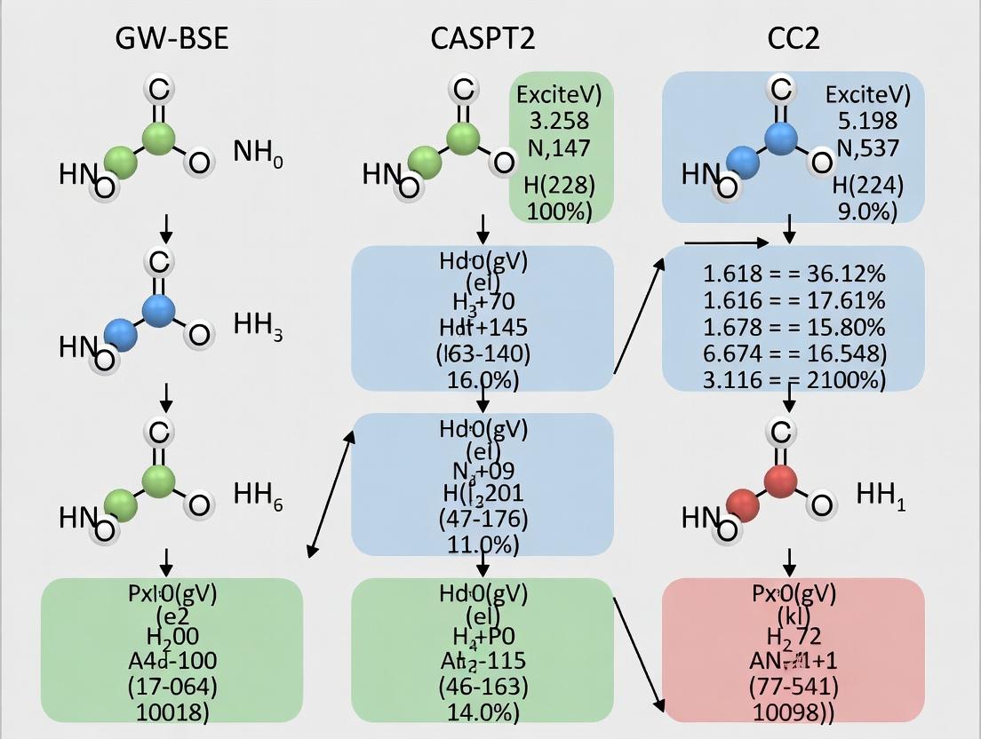 This article provides a comprehensive benchmark analysis of three advanced electronic structure methods—GW-BSE, CASPT2, and CC2—for calculating excited state energies.