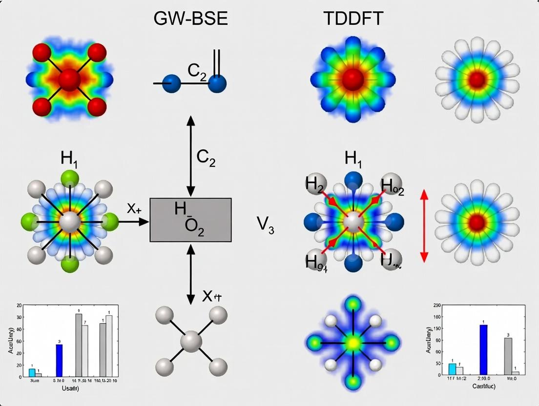 Within the ongoing research thesis comparing the accuracy of the GW-BSE (Bethe-Salpeter Equation) method and Time-Dependent Density Functional Theory (TDDFT) for simulating charge transfer excitations, this guide provides a performance comparison. Charge transfer excitations, crucial for understanding photovoltaic materials, photocatalysis, and biological chromophores, are a known challenge for standard TDDFT functionals. This article objectively compares the GW-BSE methodology against TDDFT and other wavefunction-based alternatives, supported by recent experimental benchmarks.